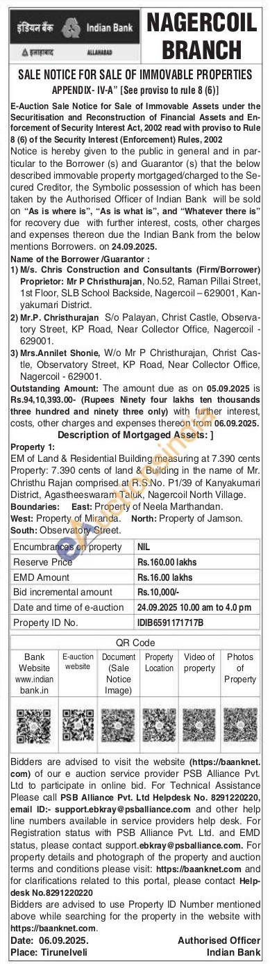 Property 1: EM of Land & Residential Building measuring at 7.390 cents Property: 7.390 cents of land & Building in the name of Mr. Christhu Rajan comprised at R.S.No. P1/39 of Kanyakumari District, Agastheeswaram Taluk, Nagercoil North Village. Boundaries: East: Property of Neela Marthandan. West: Property of Miranda. North: Property of Jamson. South: Observatory Street.