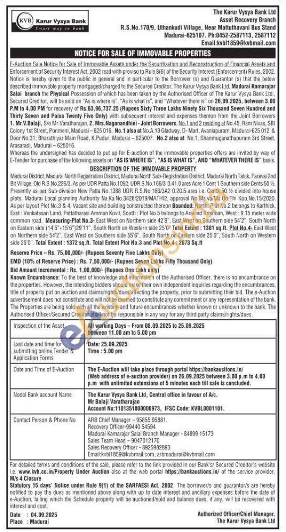 Madurai District, Madurai North Registration District, Madurai North Sub-Registration District, Madurai North Taluk, Paraval 2nd Bit Village. Old R.S. No.226/3. As per UDR Patta No. 1092, UDR S.No. 166/3 0.41.0 ares Acre 1 Cent 1 Southern side Cents 50 Presently as per Sub-division New Patta No. 1388 UDR R.S.No. 166/342 0.20.5 ares ie. Cents 50 % divided into house plots. Madurai Local planning Authority Na.Ka. No. 3428/2019/MATH12, approval No.Ma.va/Ma.Oo. Thi Koo. No. 15/2020. As per layout Plot No.3 & 4, Vacant site and building constructed thereon Bounded: North: Plot No 2 belongs to Karthick, East: Venkatesan Land, Pattatharasi Amman Kovil, South: Plot No.5 belongs to Aravind Krishnan, West: 9.15 meter wide common road. Measuring-Plot No.3- East West on Northern side 42'9", East West on Southern side 54'2", South North on Eastern side (14'5"+15'6") 29'11", South North on Western side 25'0" Total Extent: 1301 sq.ft. Plot No.4- East West on Northern side 54'2", East West on Southern side 55'6", South North on Eastern side 25'0", South North on Western side 25'0". Total Extent: 1372 sq.ft. Total Extent Plot No.3 and Plot No.4: 2673 Sq.ft
