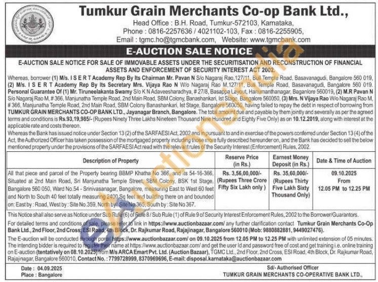 All that piece and parcel of the Property bearing BBMP Khatha No 366, and its 54-16-366, Situated at 2nd Main Road, Sri Manjunatha Temple Street, SBM Colony, BSK 1st Stage. Bangalore 560 050, Ward No.54 - Srinivasanagar, Bangalore, measuring East to West 60 feet and North to South 40 feet totally measuring 2400 Sq feet and building there on and bounded on: East by: Road, West by: Site No.359, North by: Site No. 365, South by: Site No 367