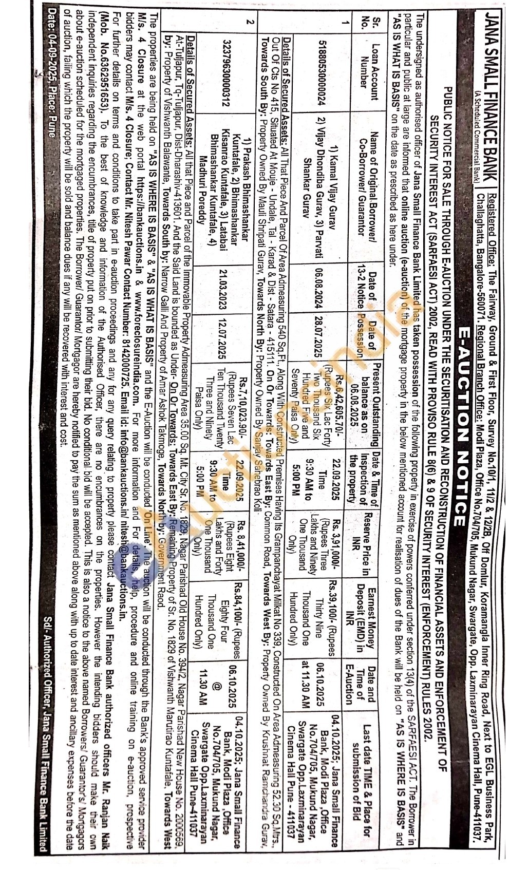 Details of Secured Assets: All that Piece and Parcel of the Immovable Property Admeasuring Area 35.00 Sq. Mt. City Sr. No. 1829, Nagar Parishad Old House No. 394/2, Nagar Parishad New House No. 2000569, At-Tuljapur, Tq-Tuljapur, Dist-Dharashiv-413601. And the Said Land is bounded as Under- On Or Towards: Towards East By: Remaining Property of Sr. No. 1829 of Vishwanth Marutirao Kuntafale, Towards West by: Property of Vishwanth Balawante, Towards South by: Narrow Galli And Property of Amar Ashok Takmoge, Towards North by: Government Raod.