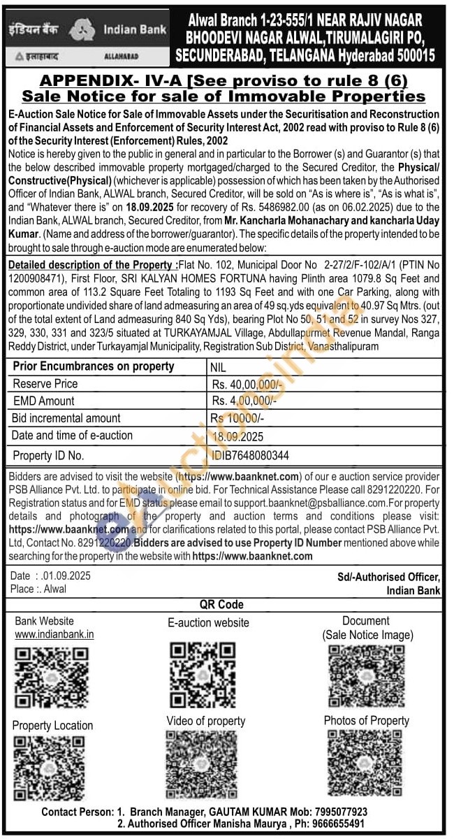Flat No. 102, Municipal Door No 2-27/2/F-102/A/1 (PTIN No 1200908471), First Floor, SRI KALYAN HOMES FORTUNA having Plinth area 1079.8 Sq Feet and common area of 113.2 Square Feet Totaling to 1193 Sq Feet and with one Car Parking, along with proportionate undivided share of land admeasuring an area of 49 sq. yds equivalent to 40.97 Sq Mtrs. (out of the total extent of Land admeasuring 840 Sq Yds), bearing Plot No 50, 51 and 52 in survey Nos 327, 329, 330, 331 and 323/5 situated at TURKAYAMJAL Village, Abdullapurmet Revenue Mandal, Ranga Reddy District, under Turkayamjal Municipality, Registration Sub District, Vanasthalipuram