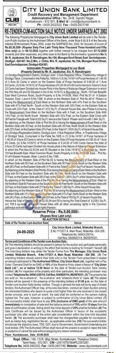 (1) Dindigul Registration District, Dindigul Joint: II Sub-Registrar Office, Thadikombu Village of Dindigul Taluk, Comprised in the Patta No. 1605 in (1) S.No. 1418/1 of Punja Hectares of 1.46.00 of 3 Acre 62 Cents in which on the Eastem Side of Punja Hectares of 0.66.00 of 1 Acre 63 Cents. (2) S.No.1419/1C of Punja Hectares of 0.24.00 of 0-60 Cents Hence to Total of 2 Acre 23 Cents had been Divided into House Plots in the Name of Kalaivani Nagar Extension in which the Plot Nos 49 and 50 Situated in the S.No.1419/1C is Bounded by North-18 Feet Breadth East West Common Road, South-Property in S.No. 1419/28, West-Plot No.51 of H.Sadam Hussian, East-Land in S.No. 1396. In which on the Western Side of Plot No. 49 of Phase-l is having the Measurement of East-West on the Northern Side with 47% Feet on the Southern Side with 47% Feet North-South on the Western Side with 33% Feet, on the Eastern Side as Cross with 33% Feet, to the Total of 1,612 Sq. Ft. of Vacant House Site, also Phase-ll is having the Measurement East-West on the Northem Side with 0 Feet, on the Southem Side With 13% Feet, on the North-South Westem Side with 33% Feet, on the Eastern Side Cross with 38 Feet lie Triangle with Total of 232 Sq. Ft. hence to the Total of Phase-land is with 1,844 Sq Ft. By adjoining on the Westem Side of Plot No. 50 is having the Measurement of East-West on the Northem Side with 35 Feel, on the Southem Side with 35 Feet, North-South on the Westem Side with 32% Feet, on the Eastern Side 33% Feet, to the Total of 1,163% Sq. Ft. of Vacant House Site (11) Dindigul Registration District, Dindigul Joint. II Sub-Registrar Office, in Thadikombu Village of Dindigul Taluk, Comprised in the Patta No. 1605 in (1) S.No.1418/1 of Purja hectares of 1.46.00 of 3 Acre 62 Cents in which on the Eastern Side of Punja Hectares of 0.66.00 of 1 Acre 63 Cents. (2) 5.No. 1419/1C of Punja hectares of 0.24.00 of 0-60 Cents Hence the total of 2 Acre 23 Cents had been Divided into House plots in the Nature of Kalaivani Nagar Extension in which the Plot Nos 52.53.54 and 55 Situated in the S.No.1419/TC Bounded by North 18 Feet Breadth East-West Common Road, South-Property in S.No. 1419/2B, East - Plot No. 51 of H Sadam Hussain, West-Land in S.No. 1396