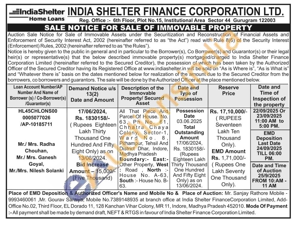 All That Piece And Parcel Of House. No. 63, Ph No. 61, Chhatra Chaya Colony, Sector-1, Ward No. 8, Pithampur, Tehsil And District Dhar, Indore, Madhya Pradesh Boundary:- East: Other Property, West Road North :-House No. A-63, South: House No. B-63.