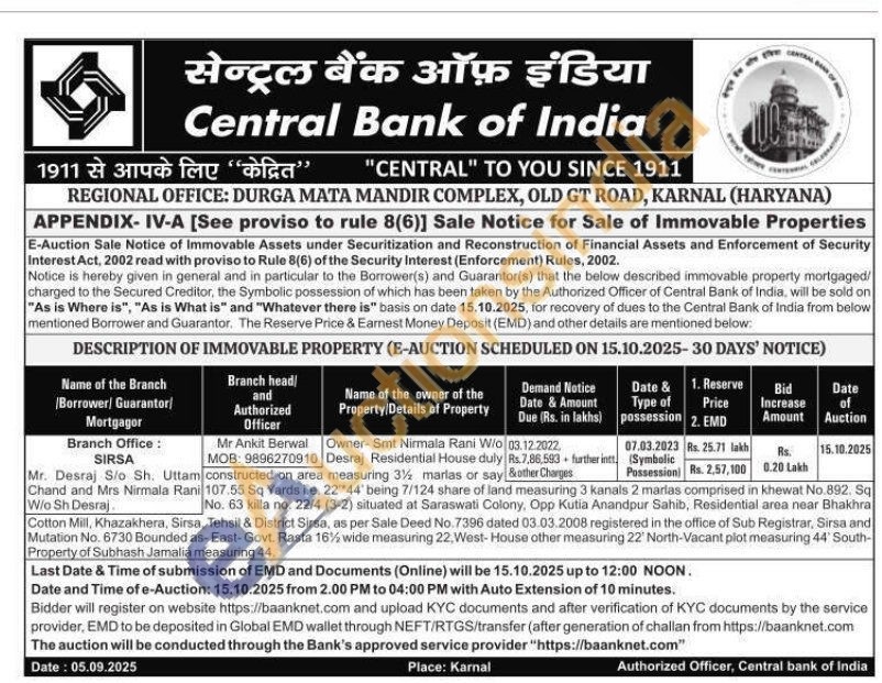 Residential house of land measuring 3 kanals 2 marlas comprised in khewat No.892. Sq W/o Sh Desraj. No. 63 killa no. 22/4 (3-2) situated at Saraswati Colony, Opp Kutia Anandpur Sahib, Residential area near Bhakhra Cotton Mill, Khazakhera, Sirsa, Tehsil & District Sirsa