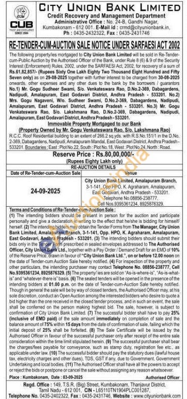R.C.C. Roof Residential building to an extent of 266.2 sq yds. with R.S.No. 151/1 in the D.No. 2-369, Dabagardens, Nadipudi, Amalapuram Mandal, East Godavari District, Andhra Pradesh-533201. Boundaries: East: Plot No. 22, South: Plot No. 18. West. Plot No.24, North: Road