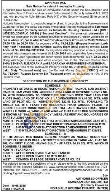 PROPERTY SITUATED IN REGISTRATION DISTRICT RAJKOT, SUB DISTRICT RAJKOT, GAM VAVDI NON-AGRICULTURAL LAND OF REVENUE SURVEY NO. 16, WITH PERMISSION TO CONSTRUCT BUILDING OVER THAT LAND FOR PLOTS PAIKI LAND OF PLOT NO. 11, ADMEASURING 543.46 SQ. MTS, AND LAND OF PLOT NO. 12, ADMEASURING 522.56 SQ. MTS., TOTALLING TO 1066.02 SQ. MTS. FLATS FOR RESIDENCE FROM GROUND FLOOR TO FOURTH FLOOR, CONSTRUCTED ON THAT LAND HAVING TOTAL THREE WINGS LE. WING-A, WING-BAND WING-C THAT THREE BUILDINGS WHICH IS KNOWN AS "BALAJI RESIDENCY", MEASUREMENT AND BOUNDARIES OF THAT BUILDING ARE AS UNDER:
