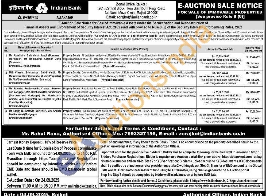 Property Details: All that pieces and parcel of Residential House situated at Shree Shaktidham, Khapat Area, R.S. No.50 Paiki, Plot No. 69 paiki part (Block) no. A. Tal-Porbandar, Dist-Porbandar, Gujarat-360579 in the name of Mr. Akashbhai Bhikhubhai Jungi (Admeasuring 49.351 Sq Mt.). Boundaries: North: Property of Plot No. 68: South: Remaining portion of plot no. 69 870 Paiki part no. B, East: Property of Plot No. 56; West: 7.50 Mtr wide Road (Physical Possession)