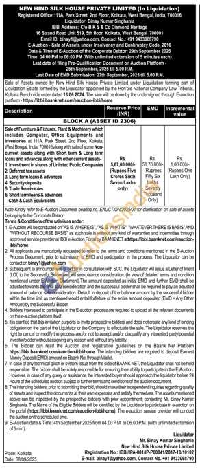 Sale of Fumiture & Fixtures, Plant & Machinery which includes Computer, Office Equipments and inventories at 111A, Park Sheet 2nd Floor, Nokata West Bengal, India, 700018 along with sale of some Non-cument assets along with Short term & Long term loans and advances along with other current assets 1. Investment in shares of Unlisted Public Companies 2. Deferred tax assets 3. Long term loans & advances 4. Security deposits 5. Trade Receivables