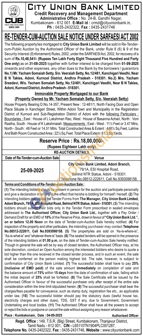 House Property Bearing D.No. 14-357, Present New: 12-481/1, North Facing Door and Open Place Situate in Kanchigeri Street, Within Adoni Town and Municipality in the Registration District of Kurnool and Sub-Registration District of Adoni with the following Particulars: Boundaries: East: House of L Lakshman Rao, West: House of Basanna Achari, North: Voni Rastha, South: House of K Lakshmaiah. Measurements: East-West: 11% Feet or 3.47 Mtrs, North-South: 48 Feet or 14.51 Mirs. Total Constructed Area & Extent: 448% Sq. Feet, Latrine And Bath Room Constructed Area: 22% Sq. Feet. Total Place Extent: 61.3 Sq. Yards.