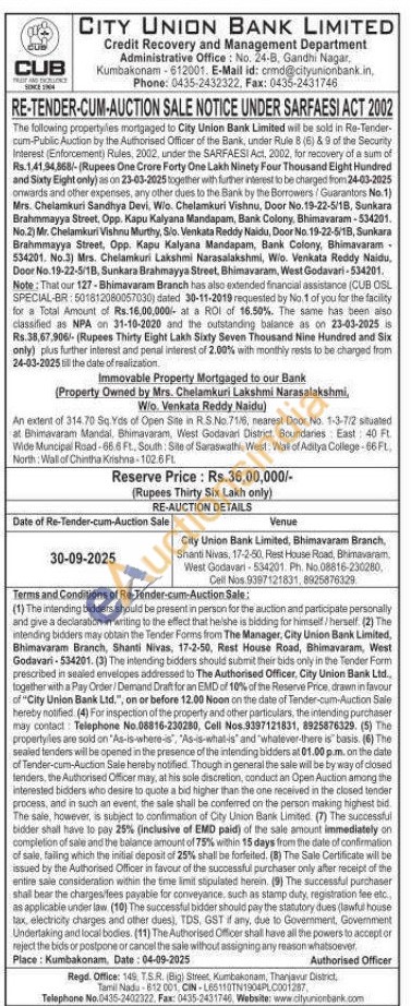 Immovable Property Mortgaged to our Bank (Property Owned by Mrs. Chelamkuri Lakshmi Narasalakshmi, W/o. Venkata Reddy Naidu) : An extent of 314.70 Sq. Yds of Open Site in R.S.No. 71/6, nearest Door No. 1-3-7/2 situated at Bhimavaram Mandal, Bhimavaram, West Godavari District. Boundaries: East: 40 Ft. Wide Muncipal Road-66.6 Ft., South: Site of Saraswathi, West: Wall of Aditya College-66 Ft, North: Wall of Chintha Krishna-102.6 Ft