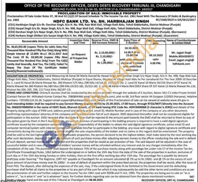 Land Measuring 56 Kanal 00 Marla Owned By Harpal Singh And Darshan Singh 5/o Najar Singh, R/o H. No. 998, Raje Wali Gali, Village Kotli Ablu, Tehsil Giddarbaha, District Muktsar (Punjab) In Equal Shares, Situated At Village Kotli Ablu As Per Jamabandi For The Year 2009-10 Describe As: 1. Land 05 Kanal 06 Marla Khewat No. 360 Khatoni 575 Mus. 298 Killa 14/1(4-8), 15/1/1(0-18). 2. Land 02 Kanal 10 Maria 50/156 Share Of 07 Kanal 16 Marla Khewat No.360 Khatoni No.580 Mus. 298 Killa 24/2(3-18), 25/2(3-18). 3. Land 48 Kanal 4 Marla 964/3953 Share Of 197 Kanal 13 Maria Khewat No.116, Khatoni No.204, 205, 206, 212 Total Kitte 36(197-13).