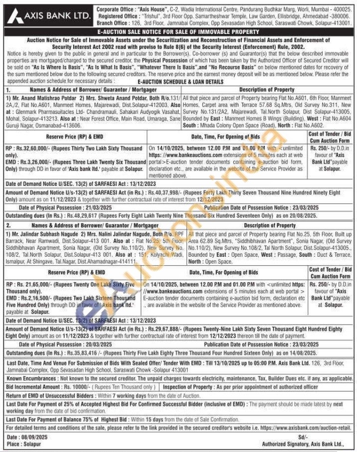 All that piece and parcel of Property bearing Flat No.25. 5th Floor, Built up Area 62.89 Sq.Mtrs, "Siddhibhavan Apartment", Sonia Nagar, (Old Survey No.110/2), New Survey No.108/2, Tal North Solapur, Dist. Solapur-413005 Bounded by East: Open Space, West: Passage, South: Duct & Terrace, North: Open Space.