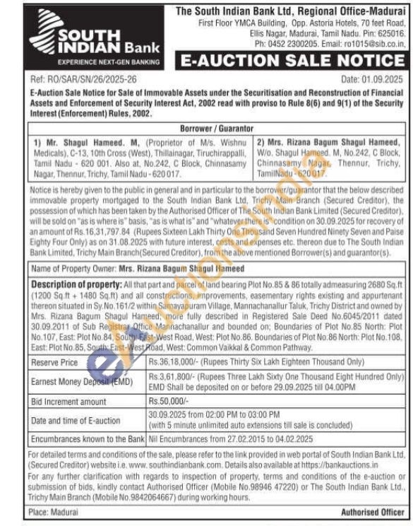 All that part and parcel of land bearing Plot No.85 & 86 totally admeasuring 2680 Sq.ft (1200 Sq.ft 1480 Sq.ft) and all constructions, improvements, easementary rights existing and appurtenant thereon situated in Sy. No. 161/2 within Samayapuram Village, Mannachanallur Taluk, Trichy District and owned by Mrs. Rizana Bagum Shagul Hameed; more fully described in Registered Sale Deed No.6045/2011 dated 30.09.2011 of Sub Registrar Office Mannachanallur and bounded on; Boundaries of Plot No.85 North: Plot No. 107, East: Plot No.84, South: East-West Road, West: Plot No. 86. Boundaries of Plot No. 86 North: Plot No.108. East: Plot No. 85, South: East-West Road, West: Common Vaikkal & Common Pathway