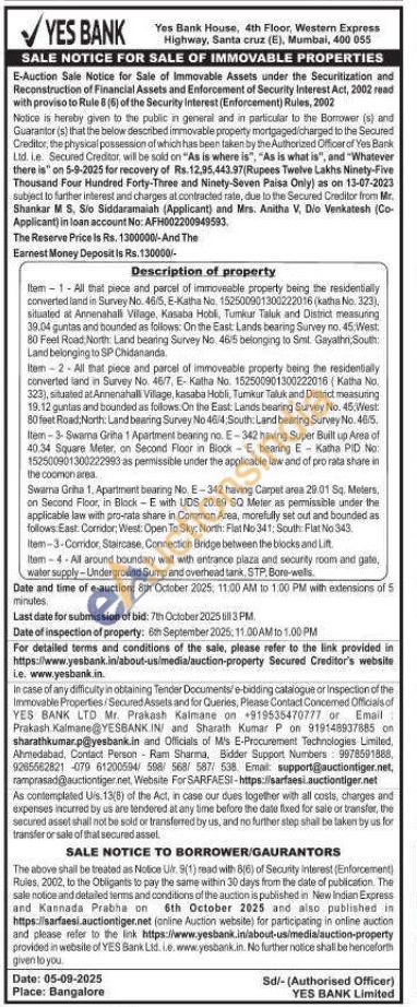 Item-1-All that piece and parcel of immoveable properly being the residentially converted land in Survey No. 46/5, E-Katha No. 152500901300222016 (katha No. 323), situated at Annenahali Vilage, Kasaba Hobili, Tumkur Taluk and District measuring 39.04 guntas and bounded as follows: On the East: Lands bearing Survey no. 45, West 80 Feet Road, North: Land bearing Survey No. 46/5 belonging to Smt. Gayathri, South Land belonging to SP Chidananda Item-2-All that piece and parcel of immoveable property being the residentially converted land in Survey No. 46/7, E- Katha No. 152500901300222016 (Katha No. 323), situated at Annenahalli Village, kasaba Hobli, Tumikur Taluk and District measuring 19.12 guntas and bounded as follows: On the East: Lands bearing Survey No. 45 West: 80 feet Road, North: Land bearing Survey No 46/4; South: Land bearing Survey No. 465. Item-3-Swama Griha 1 Apartment beanng no. E-342 having Super Built up Area of 40.34 Square Meter, on Second Floor in Block E, bearing E Katha PID No: 152500901300222993 as permissible under the applicable law and of pro rata share in the coomon area.