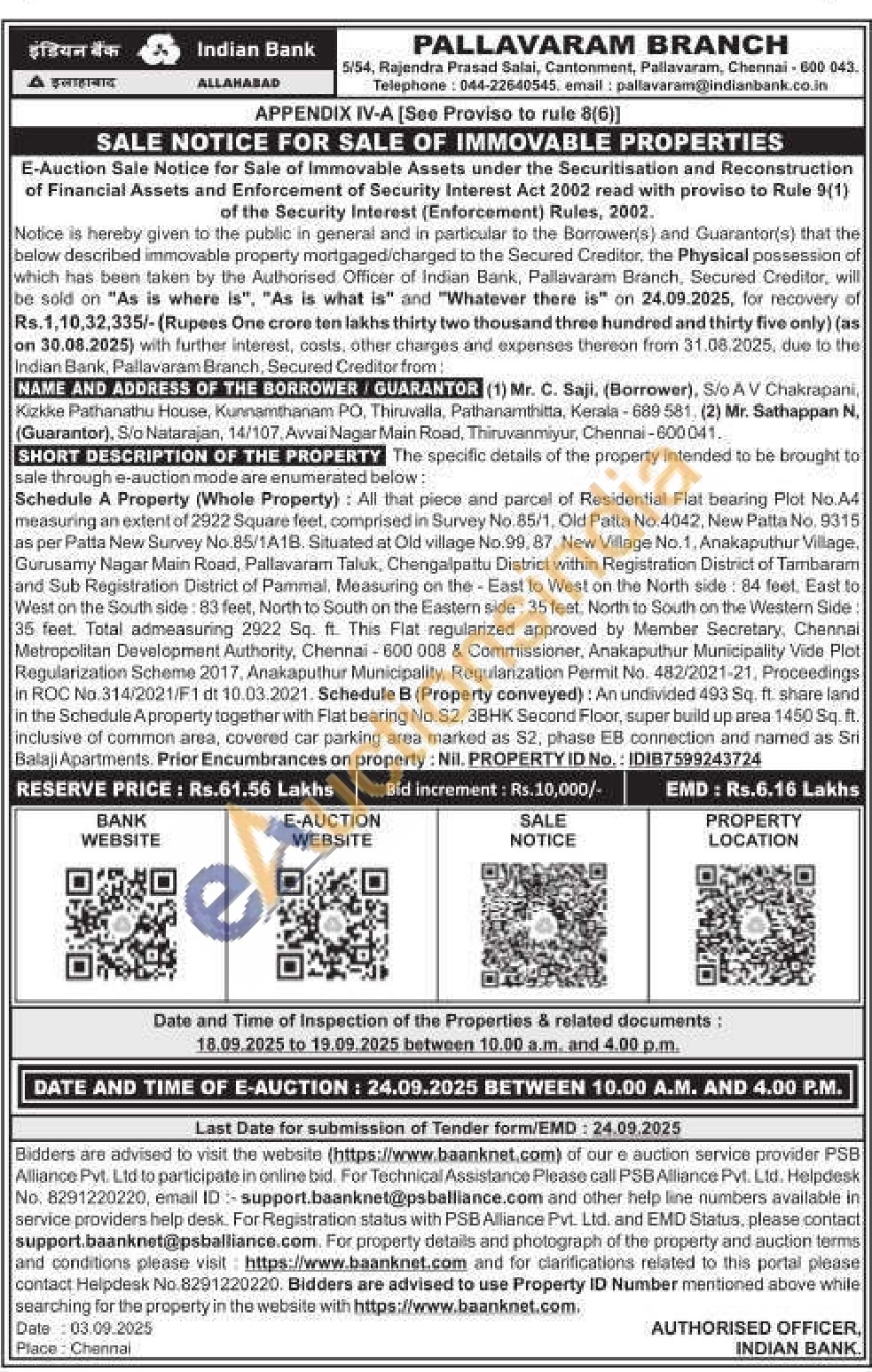 Schedule A Property (Whole Property): All that piece and parcel of Residential Flat bearing Plot No.A4 measuring an extent of 2922 Square feet, comprised in Survey No. 85/1, Old Patta No. 4042, New Patta No. 9315 as per Patta New Survey No. 85/1A1B. Situated at Old village No. 99, 87, New Village No. 1, Anakaputhur Village, Gurusamy Nagar Main Road, Pallavaram Taluk, Chengalpattu District within Registration District of Tambaram and Sub Registration District of Pammal. Measuring on the East to West on the North side: 84 feet. East to West on the South side: 83 feet, North to South on the Eastern side: 35 feet. North to South on the Western Side 35 feet. Total admeasuring 2922 Sq. ft. This Flat regularized approved by Member Secretary, Chennai Metropolitan Development Authority, Chennai-600 008 & Commissioner, Anakaputhur Municipality Vide Plot Regularization Scheme 2017, Anakaputhur Municipality, Regularization Permit No. 482/2021-21, Proceedings, in ROC No.314/2021/F1 dt 10.03.2021. Schedule B (Property conveyed): An undivided 493 Sq. ft. share land in the Schedule A property together with Flat bearing No.82, 3BHK Second Floor, super build up area 1450 Sq. ft. inclusive of common area, covered car parking area marked as S2, phase EB connection and named as Sri Balaji Apartments. Prior Encumbrances on