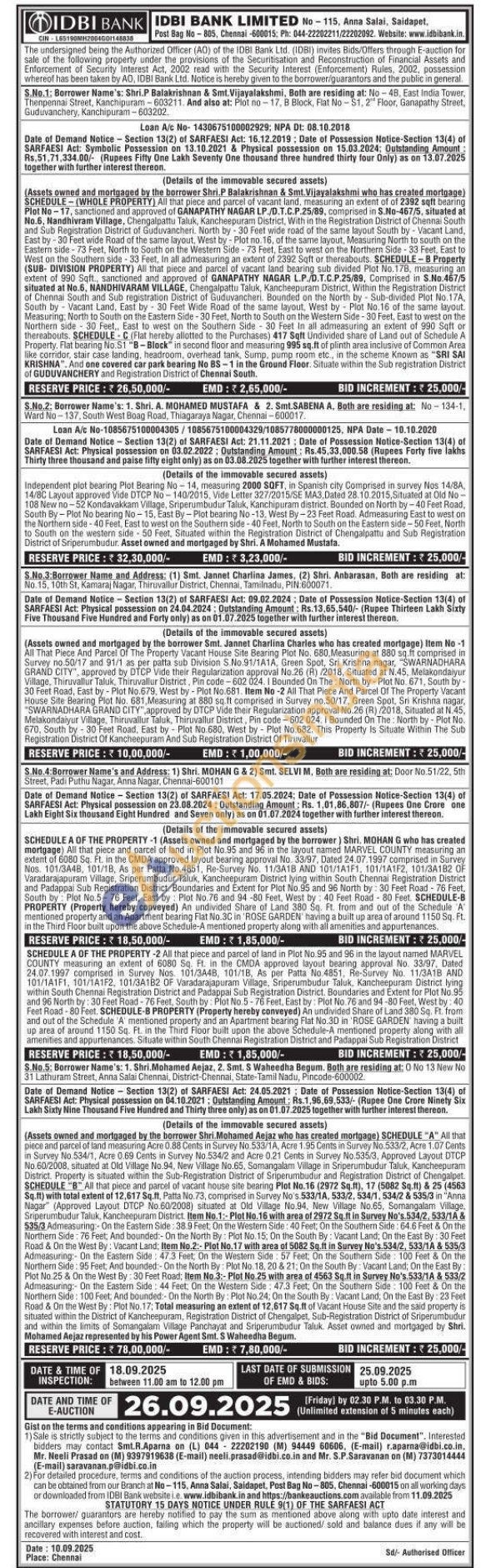 4) PROPERTY-1 (Assets owned and mortgaged by the borrower) Shri. MOHAN G who has created mortgage) All that piece and parcel of land in Plot No.95 and 96 in the layout named MARVEL COUNTY measuring an extent of 6080 Sq. Ft. in the CMDA approved layout bearing approval No. 33/97, Dated 24.07.1997 comprised in Survey Nos. 101/3448, 101/1B, As per Patta No.4851, Re-Survey No. 11/3A18 AND 101/1A1F1, 101/1A1F2, 101/3A182 OF Varadarajapuram Village, Sriperumbudur Taluk, Kancheepuram District lying within South Chennai Registration District and Padappai Sub Registration District. Boundaries and Extent for Plot No.95 and 96 North by: 30 Feet Road-76 Feet, South by Plot No.5-76 Feet, East by: Plot No.76 and 94-80 Feet, West by: 40 Feet Road-80 Feet. SCHEDULE-8 PROPERTY (Property hereby conveyed) An undivided Share of Land 380 Sq. Ft. from and out of the Schedule A mentioned property and an Apartment bearing Flat No.3C in 'ROSE GARDEN having a built up area of around 1150 Sq. Ft. in the Third Floor built upon the above Schedule-A mentioned property along with all amenities and appurtenances