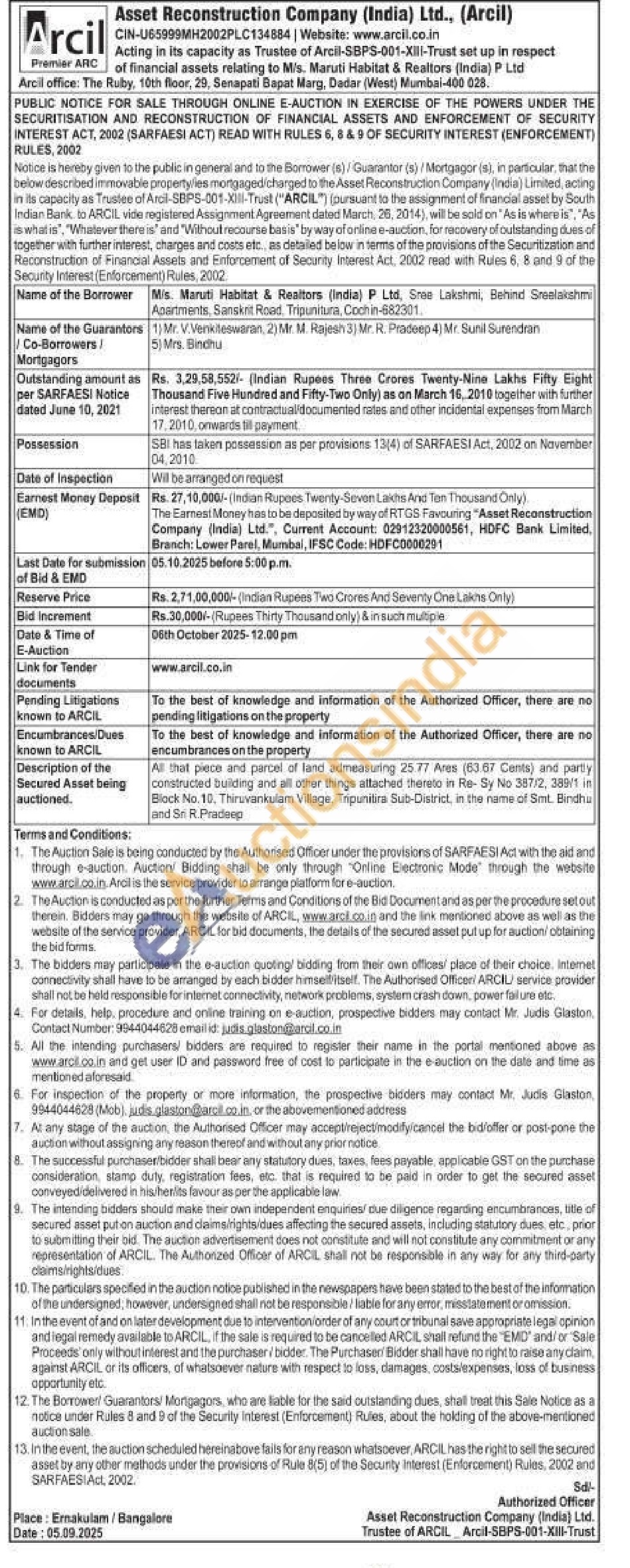 All that piece and parcel of land admeasuring 25.77 Ares (63.67 Cents) and party constructed building and all other things attached thereto in Re- Sy No 387/2, 389/1 Block No. 10, Thiruvankulam Village, Tipunstirs Sub-District, in the name of Smt. Bindha and Se R Pradeep