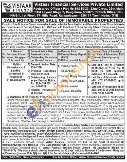 All the piece and parcel of the Immovable property In Virudhunagar District. Virudhunagar Registration District, Thiruthangal Sub Register Office, Virudhunagar District. Virudhunagar Registration District, Thiruthangal Sub Register Office, Sivakasi Taluk, Keela Thiruthangal Village, Which is includ ed in Record Ayyan Punjay Survey No. 1051 with an extent of 1278 Sq Feet on the equal of 118.77 Sq Meter Land and building nearby eastern side of 2556 sqft property belongs to Amirthavalli and admeasuring North to South Eastem side 53% feet, North to South Westem Side 53 feet East to west Southem Side 24 feet, East to West Northern side 24 feet, total an extent of 1278 sq.ft. Current subdivision Patta No 8709 survey No1051/9, and bounded on the North by Colony land, South by-15 feet width East West Street, East by Land belongs to Chinnadurai, West by-Land belongs to Seethalakshmi.
