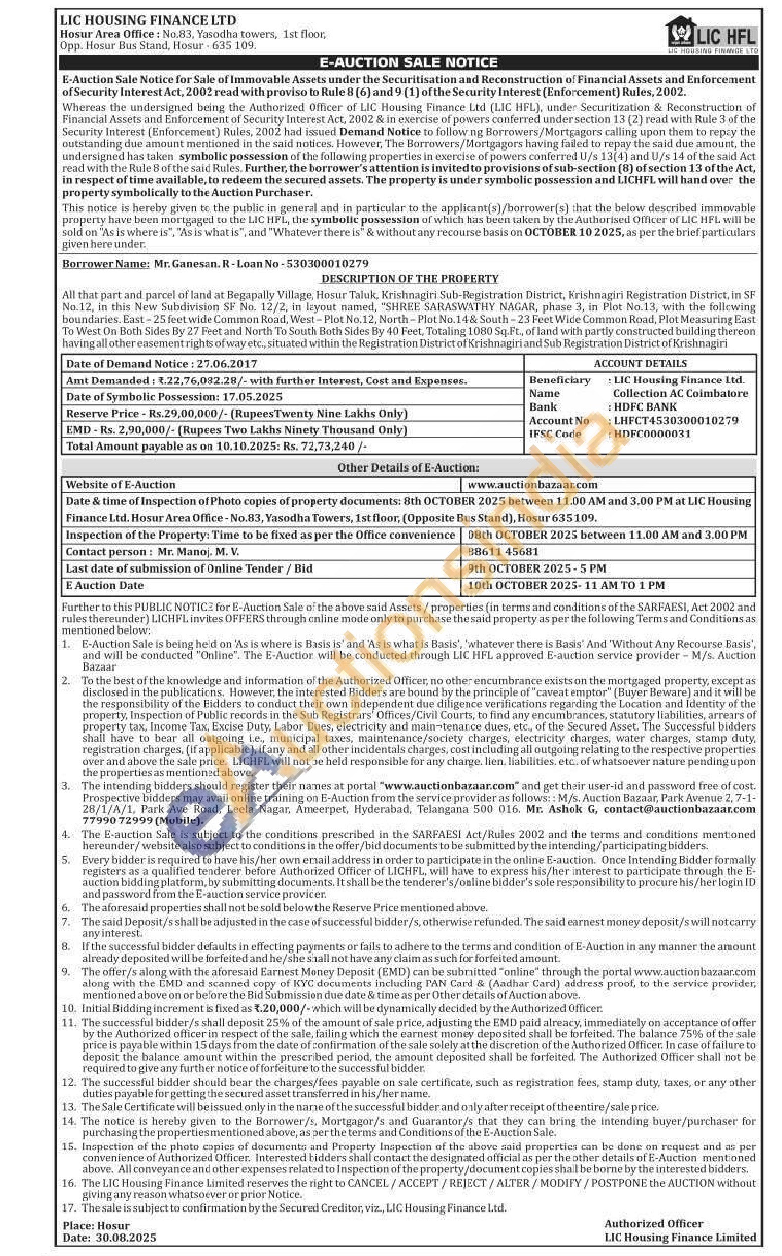 All that part and parcel of land at Begapally Village, Hosur Taluk, Krishnagiri Sub-Registration District, Krishnagiri Registration District. in SF No.12, in this New Subdivision SF No. 12/2, in layout named, "SHREE SARASWATHY NAGAR, phase 3, in Plot No.13, with the following boundaries. East-25 feet wide Common Road, West-Plot No.12, North-Plot No. 14 & South-23 Feet Wide Common Road, Plot Measuring East To West On Both Sides By 27 Feet and North To South Both Sides By 40 Feet, Totaling 1080 Sq.Ft., of land with partly constructed building thereon. having all other easement rights of way etc, situated within the Registration District of Krishnagiri and Sub Registration District of Krishnagiri