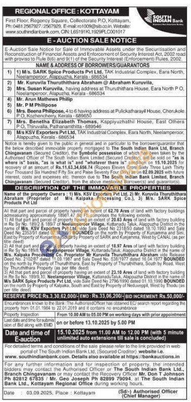 All that part and parcel of property having an extent of 62.70 Ares of land with factory buildings admeasunng approximately 18961.47 Sq Ft, comprises the following extents 1) All that part and parcel of property having on extent of 20.63 Ares of land with factory building in Re By No 1892 & 189/7 of Neelamperoor Village, Kuttanadu Taluk, Alappuzha District in the name of Mis, KSV Exporters Pvt Ltd, vide Sale Deed No 231853 dated 18.10 1993 and Sale Deed No 2353/91 dated 07.11.1991 BOUNDED on the north by Property of Kunjamma and Sini, East by Property of Kunjamma, South by Property of SARK and Kunjamma. West by CANAL, (as per title deed 21 All that part and parcel of property having an extent of 18.97 Ares of land with factory building in Re Sy No 18981. Neelamperoor Village, Kuttanadu Taluk, Alappuzha District in the name of M/s. Kalpaka Processing Co. Proprietor Mr Kuruvila Thuruthithara Abraham vide Release Deed No. 2102/87 dated 11 111.09 1987 and Sale Deed No. 538/1977 dated 16.04.1977 BOUNDED the north by Property of Thuruthithara, East by Property of Thuruthithara, South by Road. West on by Thuruthithara Property (as per title deed) 3) All that part and parcel of property having an extent of 21.10 Ares of land with factory building Re Sy No, 1800, 10. Neelamperoor Village, Kultamadu Taluk, Alappuzha District in the name of Mis SARK Spice Products Pvt Ltd, vide Sale Deed No 2796/1990 dated 01.10.1990 BOUNDED on the north by Property of Kalpaka, South and East by Properly of Neduveppil, West by Thodu (an per tille deed)