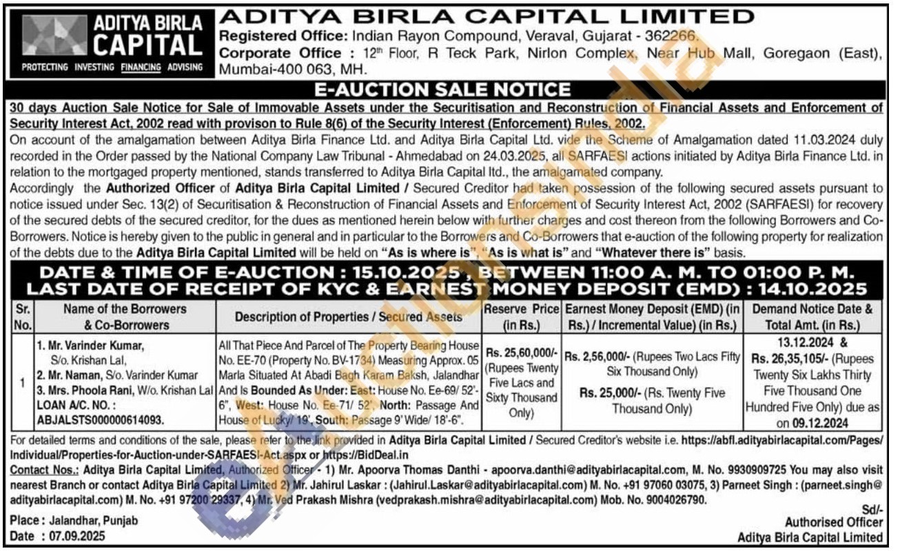 All That Piece And Parcel of The Property Bearing House No. EE-70 (Property No. BV-1734) Measuring Approx. 05 Marla Situated At Abadi Bagh Karam Baksh, Jalandhar And Is Bounded As Under: East: House No. Ee-69/52-6", West: House No. Ee-71/ 52', North: Passage And House of Lucky/ 19', South: Passage 9' Wide/ 18'-6"