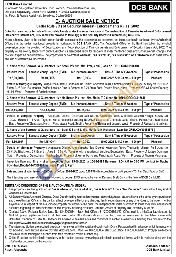 Alappuzha District, Cherthala Sub District, Cherthala Taluk, Cherthala Vadakku Village, Survey No. 11/20A2, Extent 11.11 Ares, Together with a residential building No 2/136 situated at Cherthala South Grama Panchayath. Boundaries East: Property of Sebastian, North Panchayath Road, South: Property of Beena and Joseph, West: Property of Ramachandran Nair