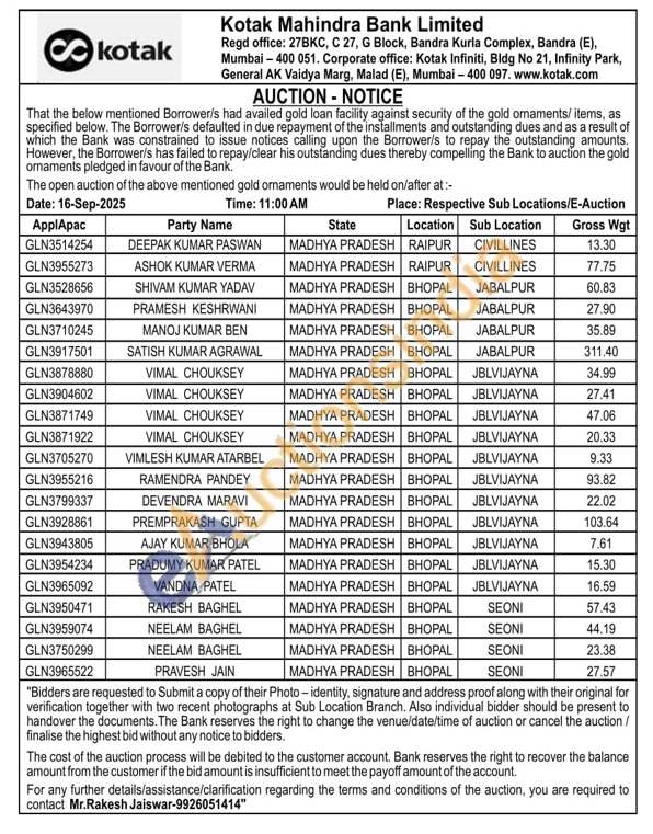 Kotak Mahindra Bank Gold Auctions Auction in Raipur