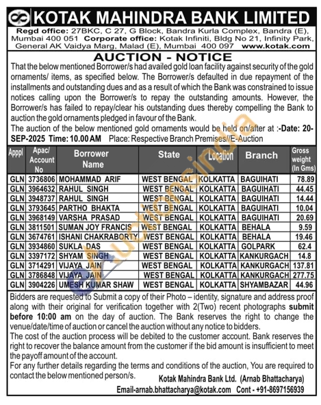 Kotak Mahindra Bank Gold Auctions Auction in Kolkata