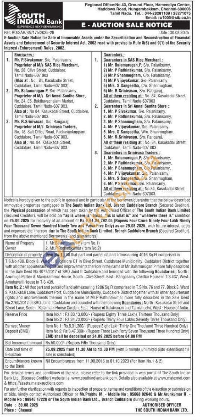 contact Authorised Officer or Mr.Prabhu M. Mobile No: 95668 02640 & Mr.Arunkumar R.. Mobile No: 98946 47220