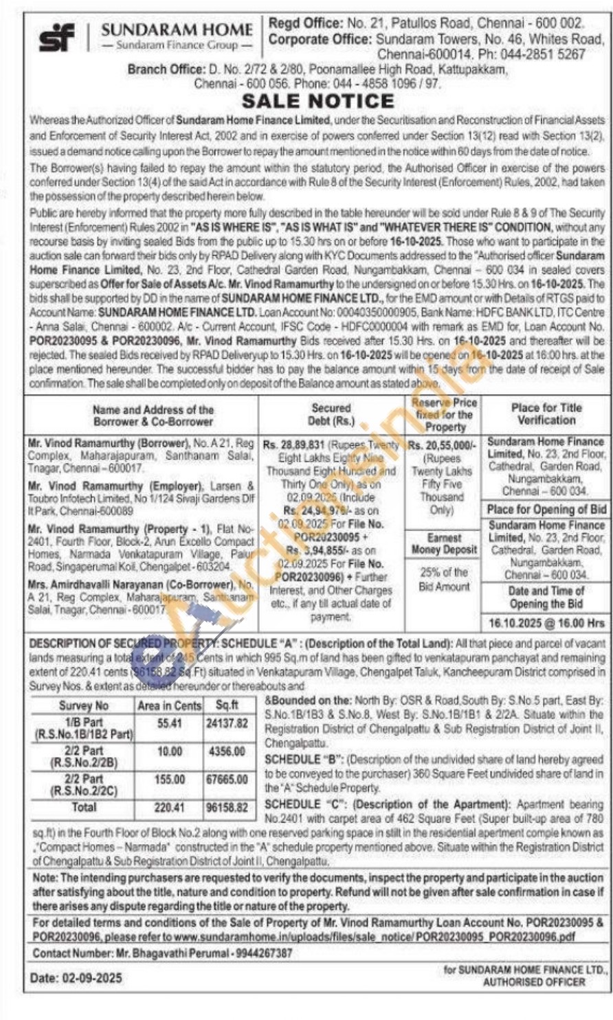 All that plece and parcel of vacant lands measuring a total extent of 245 Cents in which 995 Sq.m of land has been gifted to venkatapuram panchayat and remaining extent of 220.41 cents (96158.82 Sq Ft) situated in Venkatapuram Village, Chengalpet Taluk, Kancheepuram District comprised in Survey Nos. & extent as detailed hereunder or thereabouts and Bounded on the: North By: OSR & Road, South By: S.No.5 part, East By: S.No. 18/183 & S.No. 8. West By: S.No. 18/181 & 2/2A. Situate within the Registration District of Chengalpattu & Sub Registration District of Joint II, Chengalpattu SCHEDULE "B": (Description of the undivided share of land hereby agreed to be conveyed to the purchaser) 360 Square Feet undivided share of land in the "A" Schedule Property SCHEDULE "C": (Description of the Apartment): Apartment bearing No.2401 with carpet area of 462 Square Feet (Super built-up area of 780 sq.ft) in the Fourth Floor of Block No.2 along with one reserved parking space in stilt in the residential apertment comple known as "Compact Homes-Narmada constructed in the "A" schedule property mentioned above. Situate within the Registration District of Chengalpattu & Sub Registration District of Joint II, Chengalpattu.