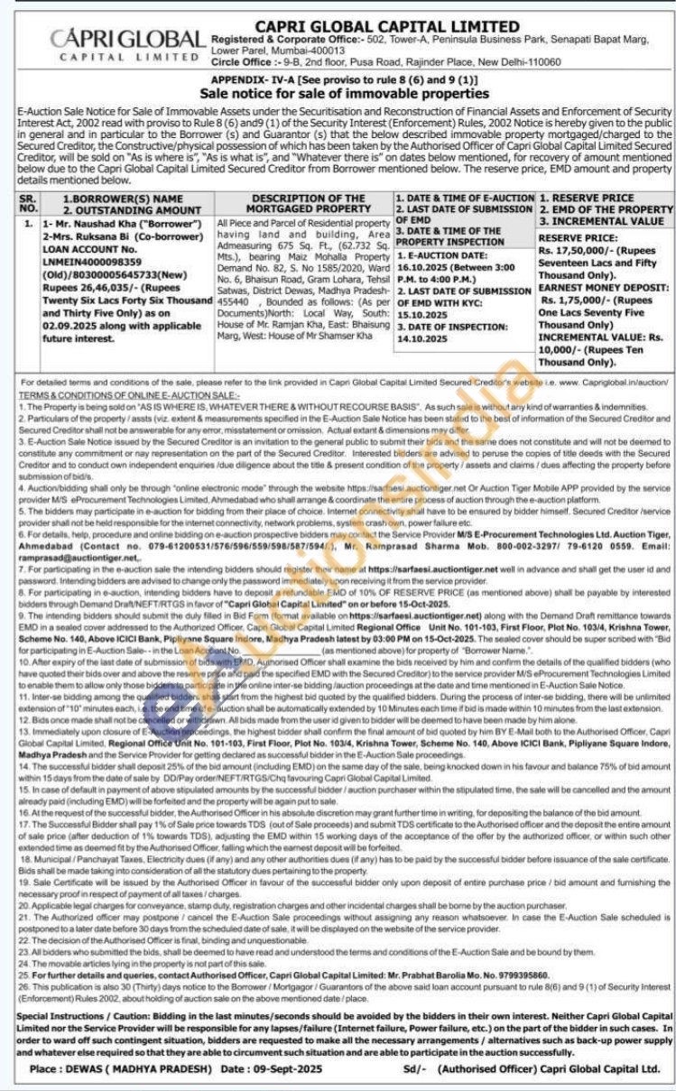 All Piece and Parcel of Residential property having land and building, Area Admeasuring 675 Sq. Ft, (62.732 Sq. Mts.), bearing Maiz Mohalla Property Demand No. 82, S. No 1585/2020, Ward No. 6, Bhaisun Road, Gram Lohara, Tehsil Satwas, District Dewas, Madhya Pradesh 455440 Bounded as follows: (As per Documents) North: Local Way, South: House of Mr. Ramjan Kha, East: Bhaisung Marg, West: House of Mr Shamser Kha
