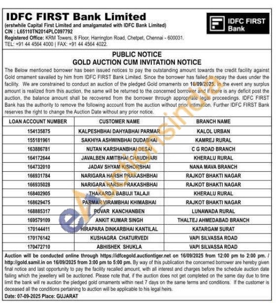 IDFC First Bank Ltd Gold Auctions Auction in Rajkot