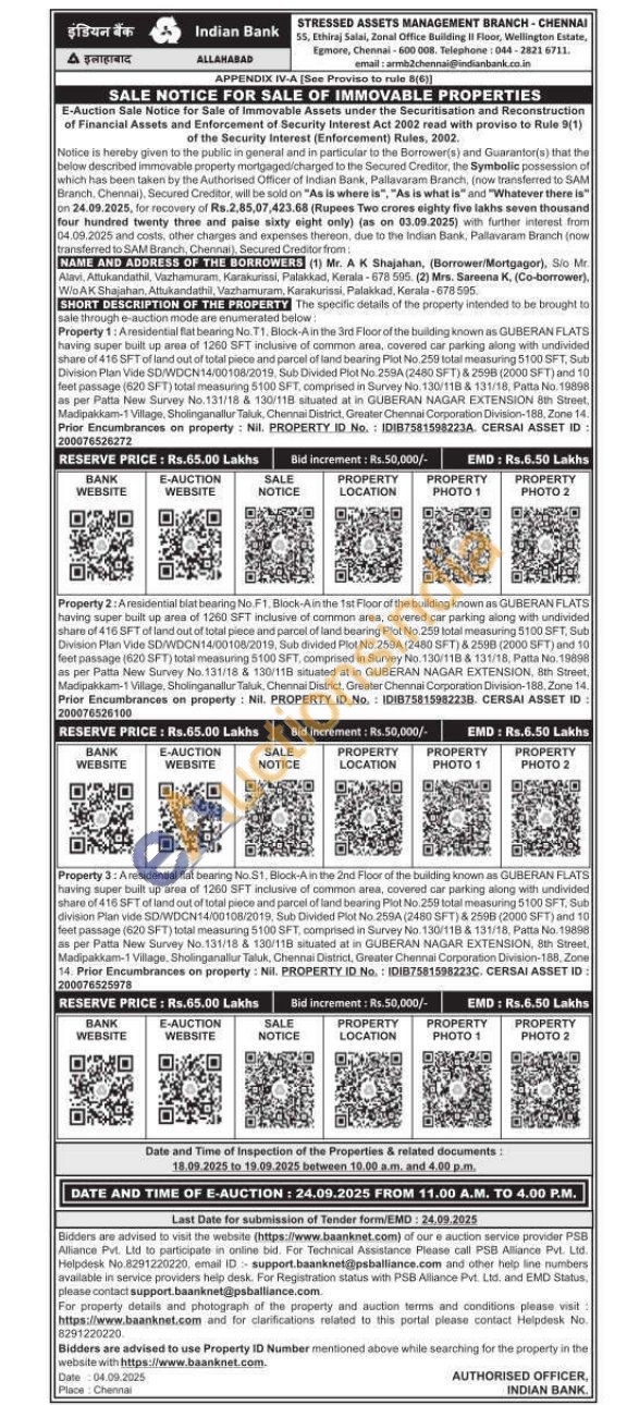 A residential flat bearing No. 11. Block-A in the 3rd Floor of the building known as GUBERAN FLATS having super bult up area of 1260 SFT inclusive of common area covered car parking along with undivided share of 416 5FT of land out of total piebe and parcel of land beaning Plot No.250 Intal measuring 5100 SFT, Sub Division Plan Vide SD/WDCN14/00108/2019. Sub Divided Plot No 258A (2480 SFT) & 2508 (2000 SFT) and 10 feet passage (620 SFT) total measuring 5100 SFT, comprised in Survey No. 130/11B & 131/18 Palta No. 19895 as per Patta New Survey No 131/18 & 130/118 situated at in GUBERAN NAGAR EXTENSION Bh Street Madipakkam-1 Vilage, Sholinganallur Taluk, Chennai District, Greater Chennai Corporation Division-188, Zone 14