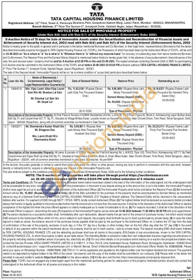 Description of the Immovable Property: All that Piece & Parcels of 02BHK Residential Unit No. L-A/II/28, Third Floor, Type LIG, Block A, Admeasuring super Builtup Area 550 Sq. Ft. and Carpet Area 427.71 Sq. FL, Situated at Village Bhilwa Kalan, Locality known as Vasundhra Kutumb, Near Chowki Dhani, Tonk Road, Tehsil Sanganer, Distt. Jaipur 302022 (Rajasthan), along with all common amenities as mentioned in Sale Deed
