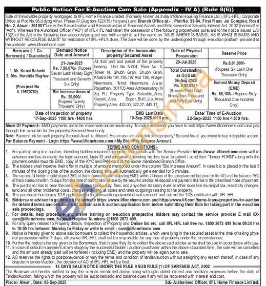 All that part and parcel of the property bearing Unit No N-004, Floor No. 0, Tower N. Shubh Grah, Shubh Grah Khasra No 194,195,197 And 198, Village-Neemrana, Tehsil Neemrana, Alwar Rajasthan, 301705 Area Admeasuring (In Sq. Ft). Property Type: Saleable Area. Carpet Area Super Built Up Area Property Area: 433.00, 322.27, 449.17