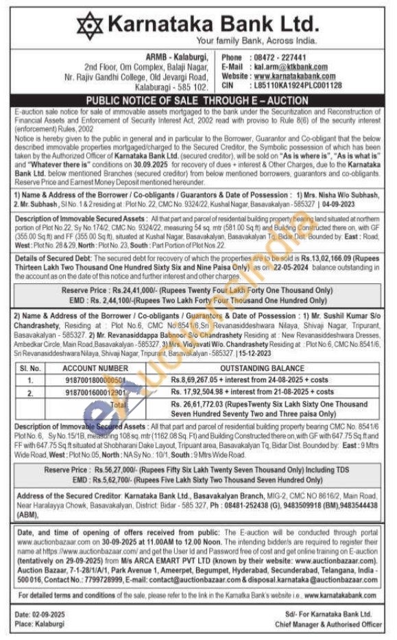 All that part and parcel of residential building property bearing CMC No. 8541/6 Plot No. 6, Sy No 15/18, measuring 108 sq. mtr (1162.08 Sq. Ft) and Building Constructed there on, with GF with 647.75 Sq ftand FF with 647.75 Sqft situated at Shobharani Dake Layout, Tripuant area, Basavakalyan Tq. Bidar Dist Bounded by: East: 9 Mtrs Wide Road, West: Plot No. 05, North: NASy No: 10/1, South: 9 Mirs Wide Road.
