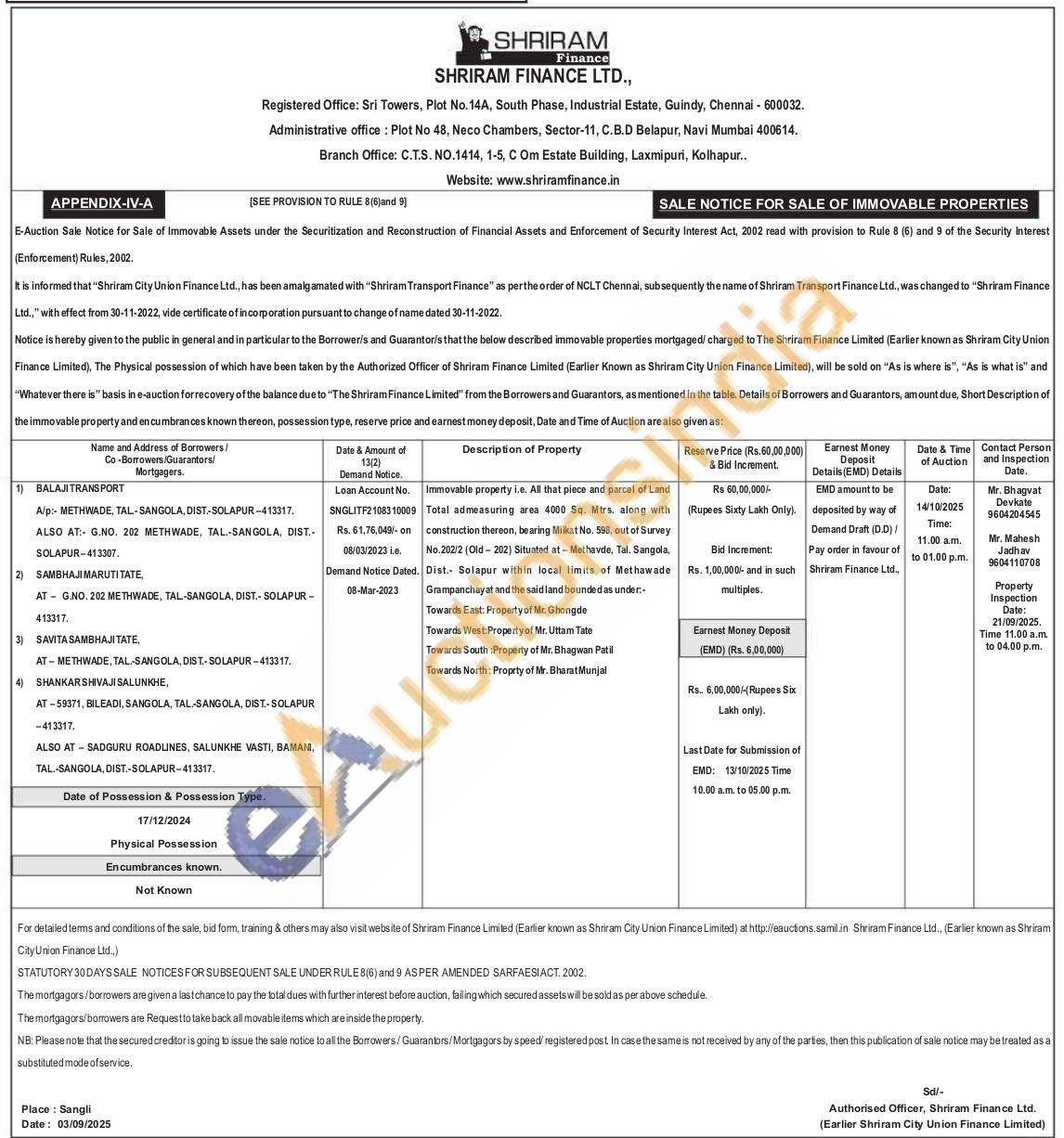 Immovable property i.e. All that piece and parcel of Land Total admeasuring area 4000 Sq. Mtrs. along with construction thereon, bearing Milkat No. 598, out of Survey No.202/2 (Old-202) Situated at Methavde, Tal. Sangola, Dist. Solapur within local limits of Methawade Grampanchayat and the said land bounded as under:-