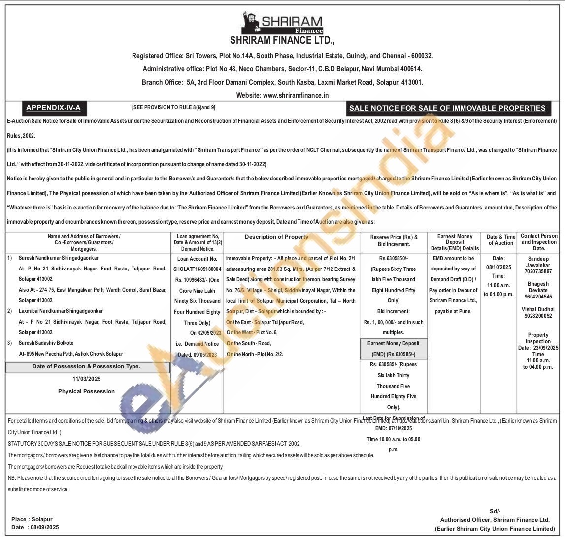 Immovable Property: All piece and parcel of Plot No. 2/1 admeasuring area 281.63 Sq. Mtrs, (As per 7/12 Extract & Sale Deed) along with construction thereon, bearing Survey No. 76/6, Village Shelgi, Siddhivinayal Nagar, Within the local limit of Solapur Municipal Corporation, Tal - North Solapur, Dist-Solapur which is bounded by:-