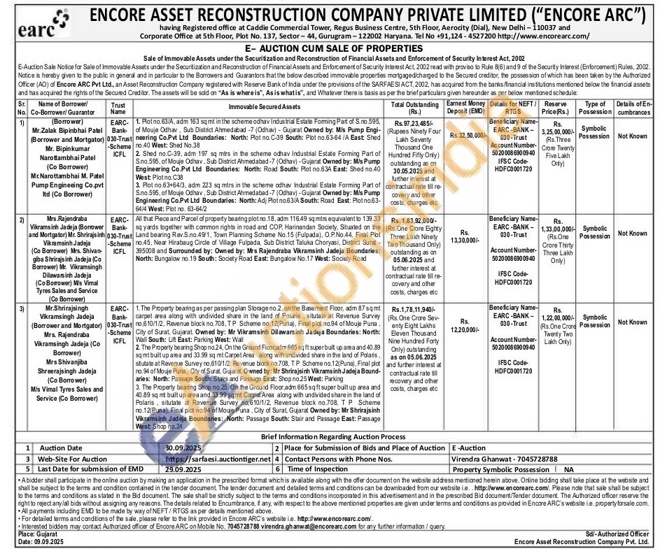 1. The Property bearing as per passing plan Storage no.2, on the Basement Floor, adm 87 sqmt carpet area along with undivided share in the land of Polaris, situtate at Revenue Survey no.610/1/2, Revenue block no. 708, TP Scheme no.12(Puna), Final plot no.94 of Mouje Puna. City of Surat, Gujarat Owned by: Mr Vikramsinh Dilawarsinh Jadeja Boundaries: North: ICFL Wall South: Lift East: Parking West: Wall 2. The Property bearing Shop no.24, On the Ground Floor,adm 665 sq ft super built up area and 40.89 sqmt built up area and 33.99 sq mt Carpet Area along with undivided share in the land of Polaris. situtate at Revenue Survey no.610/1/2, Revenue block no.708, TP Scheme no.12(Puna), Final plot no.94 of Mouje Puna, City of Surat, Gujarat. Owned by: Mr Shrirajsinh Vikramsinh Jadeja Bound-aries: North: Passage South: Stairs and Passage East: Shop no.25 West: Parking 3. The Property bearing Shop no.25, On the Ground Floor,adm 665 sq ft super built up area and 40.89 sq mt built up area and 33.99 sqmt Carpet Area along with undivided share in the land of Polaris, situtate at Revenue Survey no.610/1/2, Revenue block no.708. TP Scheme no.12(Puna), Final plot no.94 of Mouje Puna, City of Surat, Gujarat Owned by: Mr Shrirajsinh Vikramsinh Jadeja Boundaries: North: Passage South: Stair and Passage East: Passage West: Shop no.24