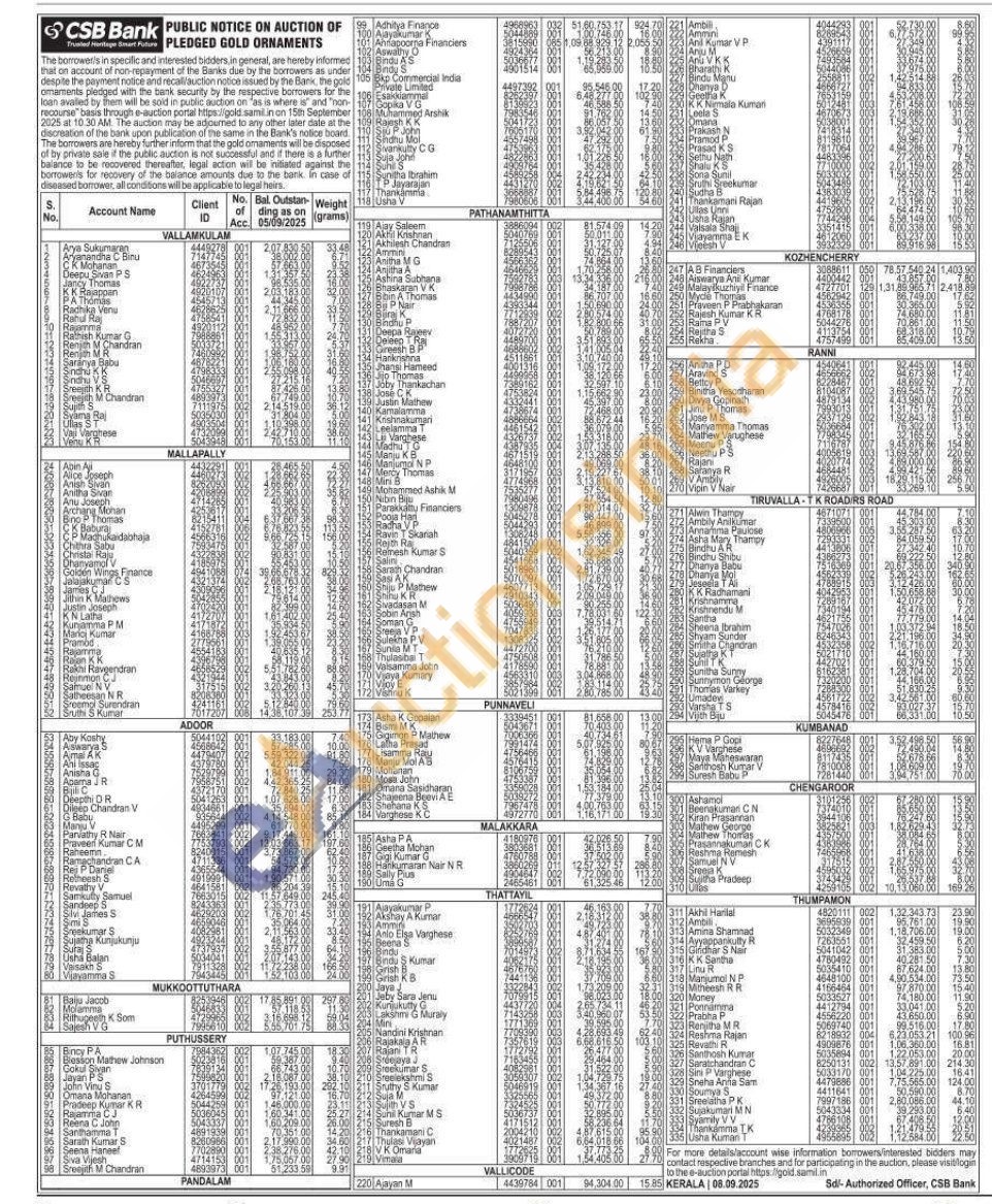 CSB Bank Gold Auctions Auction in Pathanamthitta