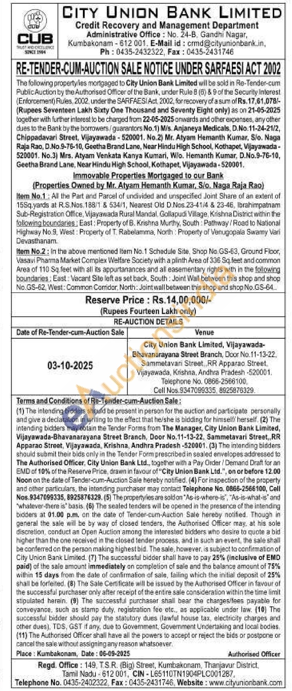 Item No.1: All the Part and Parcel of undivided and unspecified Joint Share of an extent of 158q.yards at R.S.Nos. 188/1 & 534/1, Nearest Old D.Nos 23-41/4 & 23-46, Ibrahimpatnam Sub-Registration Office, Vijayawada Rural Mandal, Gollapudi Village, Krishna District within the following boundaries: East: Property of B. Krishna Murthy, South: Pattiway/Road to National Highway No.9, West: Property of T. Rabelamma, North: Property of Venugopala Swamy Vari Devasthanam Item No.2: in the above mentioned Item No. 1 Schedule Site, Shop No. GS-63, Ground Floor, Vasavi Pharma Market Complex Welfare Society with a plinth Area of 336 Sq.feet and common Area of 110 Sq feet with all its appurtanances and all easementary rights with in the following boundaries: East: Vacant Site left as set back, South: Joint Wall between this shop and shop No.GS-62, West: Common Corridor, North. Joint wall between this shop and shop No.GS-64