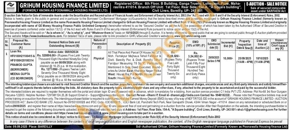 All That Piece And Parcel Of House No. 373. Moh. Farrakpur Majhaua Tehsil Faridpur & Distt. Bareilly Par, & Distt. Bareilly Tehsil Faridpur Measuring 78 Sq Y), Particularly Mentioned In Sale Deed Executed. Bound-aries As Under: East: Kharanja Nagar Palika West: House Raj Pal North: House Girwar South: House Ram Kumar