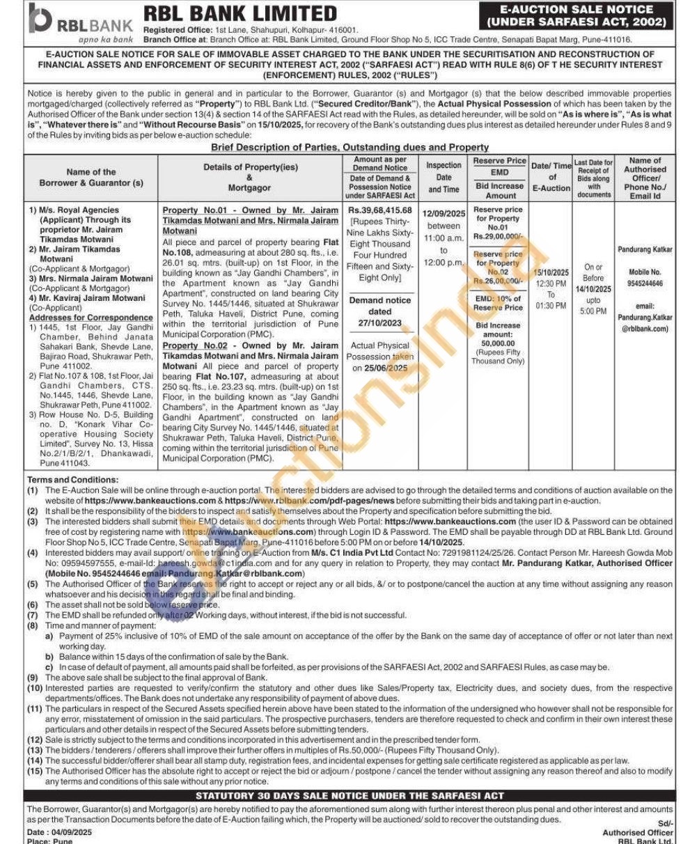 All piece and parcel of property bearing Flat No.108, admeasuring at about 280 sq. fts., i.e. 26.01 sq. mtrs. (built-up) on 1st Floor, in the building known as "Jay Gandhi Chambers", in the Apartment known as "Jay Gandhi Apartment", constructed on land bearing City Survey No. 1445/1446, situated at Shukrawar Peth, Taluka Haveli, District Pune, coming within the territorial jurisdiction of Pune Municipal Corporation (PMC).