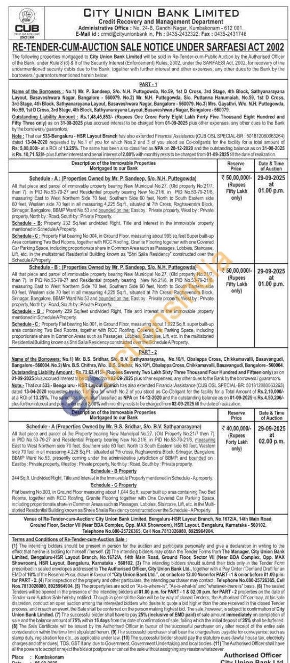 All that piete and parcel of immovable property bearing New Municipal No 27. (Old property No.21/7 then 7) in PID No.33-78-27 and Residential property cearning bearing New Now No.2116 N in PID PID No 53-79-2116 measuring East to West Northem Side 70 feet, Southern Side 60 feet. Noch to South Eastem side 60 leet, Westem side 70 letalurg 4.225 Sqft, situated at 7th Crees. Raghavendre Block. Srinagar, Bangalore, BBMP Ward No.53 and bounded on the East try: Private property, West by Private property. North by: Road South by Private Property Schedule B: Property 239 Sqfeet undivided Right, The and interest in the immovable property mentioned in Schedule A Property Schedule C. Property Flat beatrig No.001, in Ground Floor, measuring about 1,022 Super bulup aree containing Two Bed Foarte, together with RCC Roofing Covered Car Parking Space, including proportionale share in Common Areas such as Passages, Lobbies, Staircase. Lift atc. in the multistoried Residential Building known as Shri Sola Residency constitucted over the Schedala Property