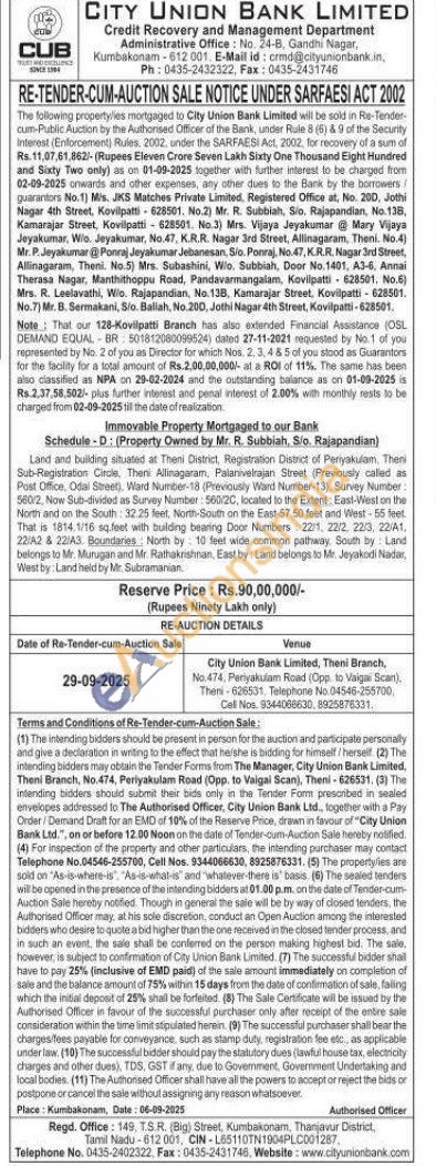 Land and building situated at Theni District, Registration District of Periyakulam, Theni Sub-Registration Cards, Theni Allinagaram, Palanivelrajan Street (Previously called as Post Office, Odai Street, Ward Number-18 (Previously Ward Number-13), Survey Number: 560/2, Now Sub-divided as Survey Number: 560/20, located in the Extent: East-West on the North and on the South 32:25 feet, North-South on the East-57.50 feet and West-55 feet That is 1814,1/16 sq.feet with building bearing Door Numbers 221, 222, 223, 22/A1 22/A2 & 22:43. Boundaries North by 10 feet wide common pathway, South by Land belongs to Mr. Murugan and Mr. Rathakrishnan, East by Land belongs to Mr. Jeyakodi Nadar, West by Land held by Mr. Subramanian,