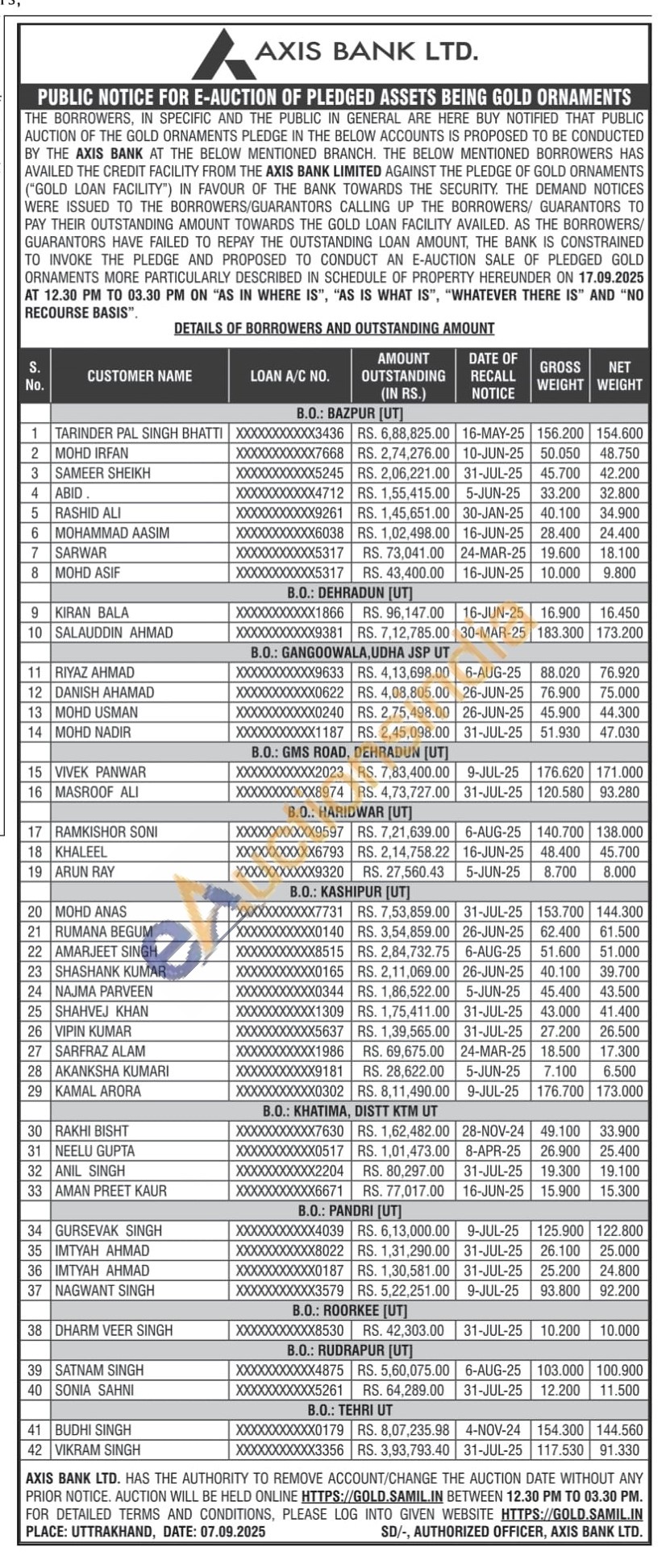 Axis Bank Gold Auctions Auction in Haridwar