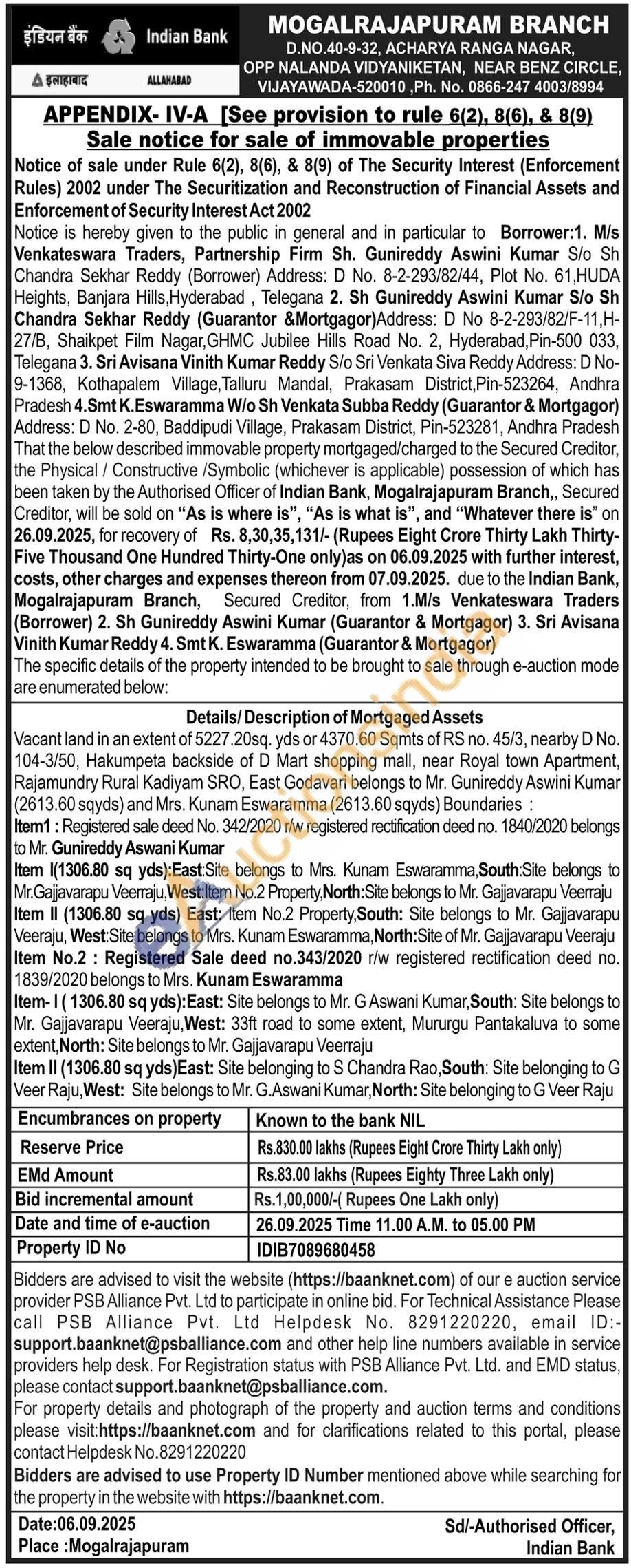 Vacant land in an extent of 5227.20sq. yds or 4370.60 Sqmts of RS no. 45/3, nearby D No. 104-3/50, Hakumpeta backside of D Mart shopping mall, near Royal town Apartment, Rajamundry Rural Kadiyam SRO, East Godavari belongs to Mr. Gunireddy Aswini Kumar (2613.60 sqyds) and Mrs. Kunam Eswaramma (2613.60 sqyds) Boundaries: Item1: Registered sale deed No. 342/2020 r/w registered rectification deed no. 1840/2020 belongs to Mr. Gunireddy Aswani Kumar Item I(1306.80 sq yds):East Site belongs to Mrs. Kunam Eswararmma, South Site belongs to Mr.Gajjavarapu Veerraju, West:Item No.2 Property, North: Site belongs to Mr. Gajavarapu Veerraju Item II (1306.80 sq yds) East: Item No.2 Property South: Site belongs to Mr. Gajjavarapu Veeraju, West:Site belongs to Mrs. Kunam Eswaramma, North: Site of Mr. Gajijavarapu Veeraju Item No.2: Registered Sale deed no.343/2020 r/w registered rectification deed no. 1839/2020 belongs to Mrs. Kunam Eswaramma Item-1(1306.80 sq yds): East: Site belongs to Mr. G Aswani Kumar, South: Site belongs to Mr. Gajjavarapu Veeraju, West: 33ft road to some extent, Mururgu Pantakaluva to some extent, North: Site belongs to Mr. Gajjavarapu Veerraju Item II (1306.80 sq yds) East: Site belonging to S Chandra Rao, South: Site belonging to G Veer Raju, West: Site belongs to Mr. G.Aswani Kumar, North: Site belonging to G Veer Raju