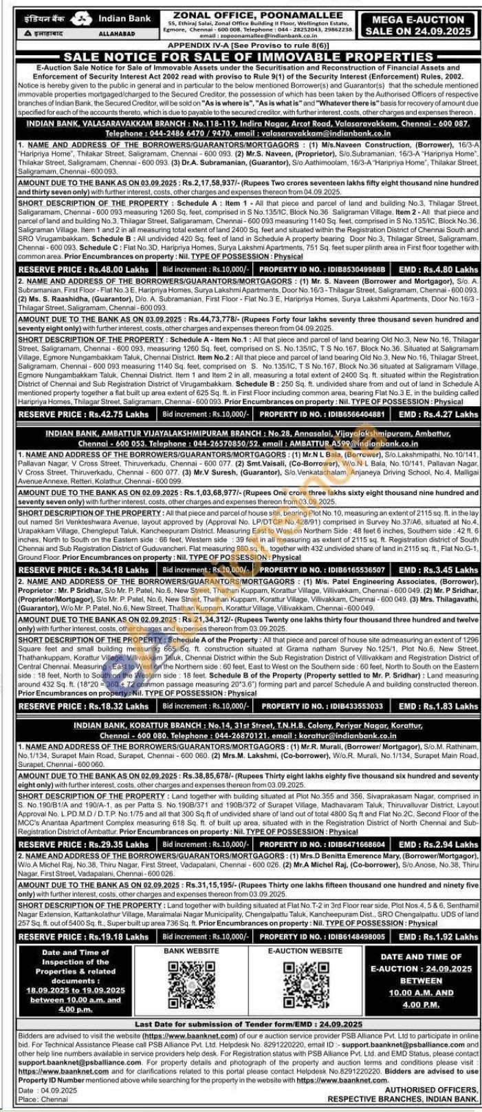 Land together with building situated at Plot No.355 and 356. Sivaprakasam Nagar, comprised in S. No. 190/B1/A and 190/A-1, as per Patta S. No. 1908/371 and 1908/372 of Surapet Vilage, Madhavaram Taluk, Thiruvalluvar District, Layout Approval No. L.PD.M.D/D.T.P. No. 1/75 and all that 300 Sq.ft of undivided share of land out of total 4800 Sq.ft and Flat No.2C, Second Floor of the MCC's Anantaa Apartment Complex measuring 618 Sq. ft. of built up area, situated with in the Registration District of North Chennai and Sub-Registration District of Ambattur. Prior Encumbrances on property: NII. TYPE OF POSSESSION: Physical