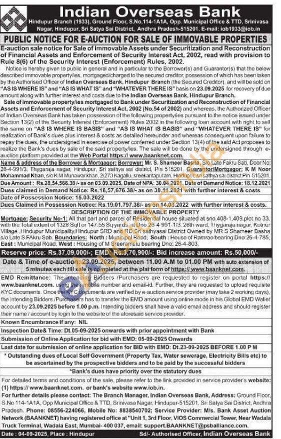 All that part and parcel of Residential house situated at sno.408-1,409, plot no 33, with the Total extent of 1328 Sqft or 147.55 Sq yards at Dno:26-4-991-1/3, 26th ward, Thygaraja nagar, Kotnur Village Hindupur Municipality. Hindupur SRD and RD. Sri sathyasai District Owned by MR S Shameer Basha s/o Late S FAkru Sab. Boundaries: North: Municipal Road, South: House of Ramrao bearing Dno:26-4-785, East: Municipal Road, West: Housing of M Sreeramulu bearing Dno: 26-4-803