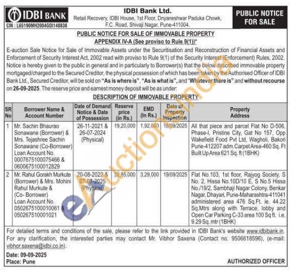 Flat No. 103, 1st floor, Rajyog Society, S No. 2, Hissa No. 100/10 E, S No.5 Hissa No./19/2, Sambhaji Nagar Colony, Benkar Nagar, Dhayari, Pune-Maharashtra-411041 administered area 476 Sq. Ft. le. 44.22 Sq.Mtrs along with Terrace, lobby and Open Car Parking C-33 area 100 Sq ft. i.e. 9.29 Sq. mtr (1BHK)